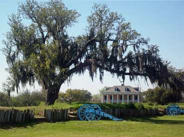 View of the American rampart or parapet and the Beauregard mansion, built in the 1840's. Jackson's headquarters was in the MaCarty house(where the present day Chalmette Slip is now), behind the rampart.